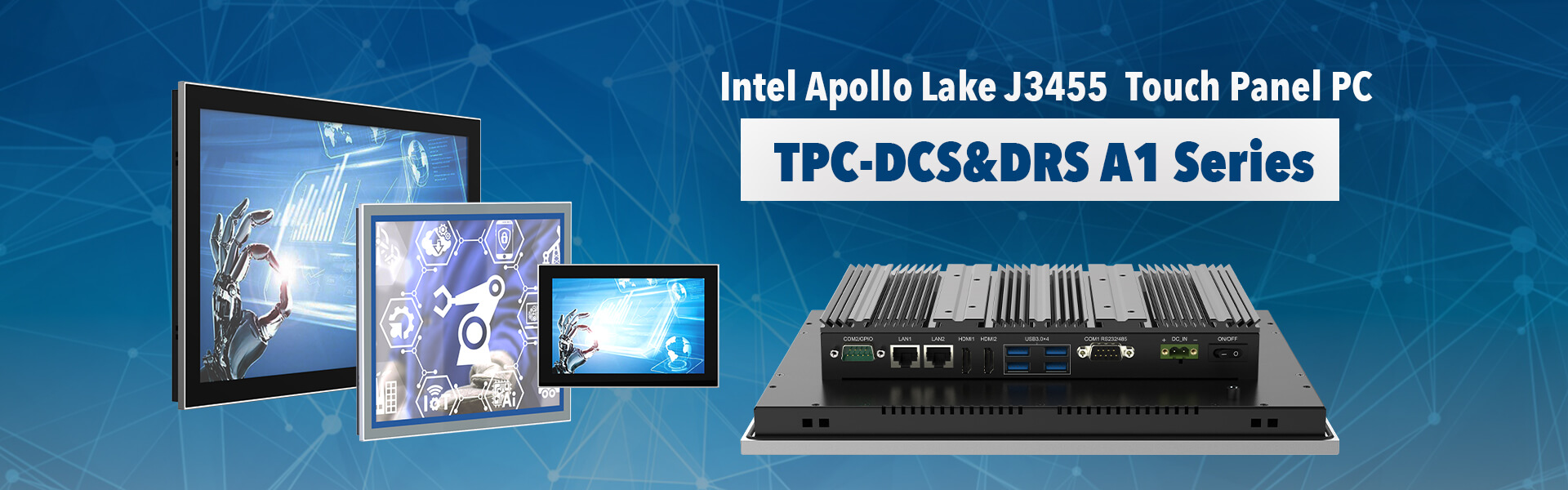 | TPC-DRS101A1 | 10.1” WXGA, Intel J3455 Quad-core CPU, Resistive Touch, 2 GbE, 4 USB3.0,2COM, 2 HDMI, Audio, DC 12V, PSU |