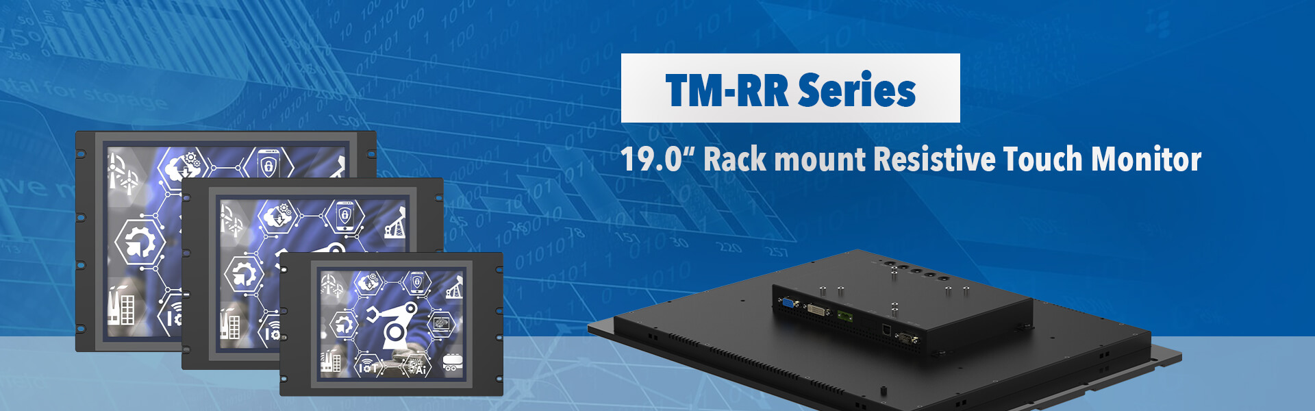 TAICENN TM-RR series is a 19.0-inch rack mount Resistive touch industrial monitor product. The design uses a high temp. 5-wires Resistive touch screen, and it can fulfill front panel NEMA/IP65 standards. The rack mount industrial monitor comes with TAICENN modular design, with 1* VGA and 1* DVI dual display input; It comes default with DC 12v and optional with wide voltage DC 9~36v input. This TM-RR rack monitor is ready to mount into standard 19-inch rack mount industrial cabinet.