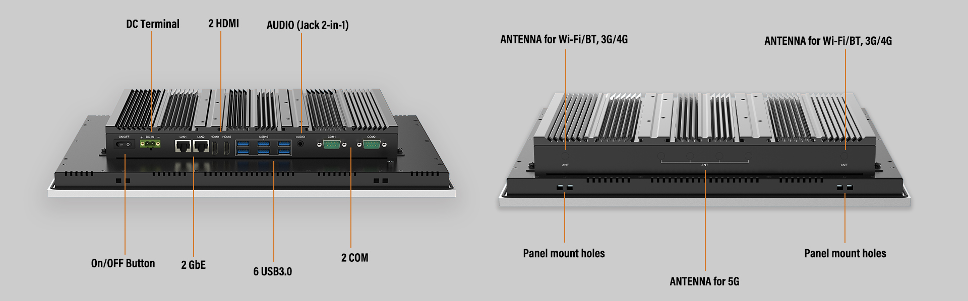  Fanless design, slim design, front IP65 rated protection.